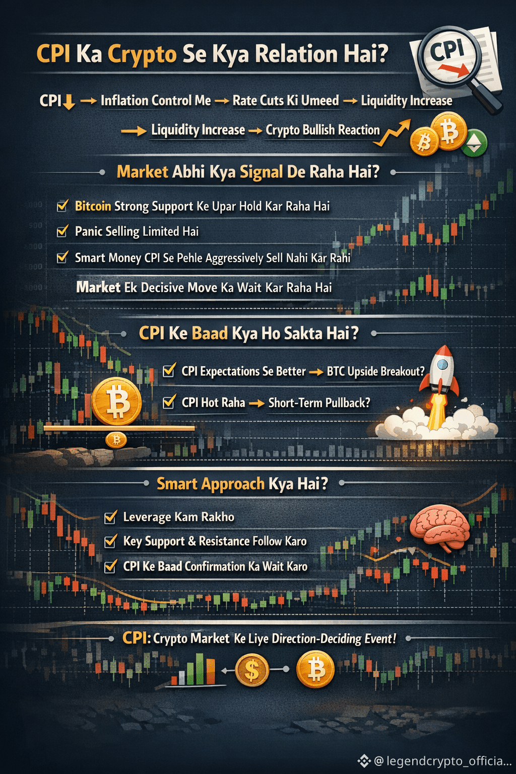Jab CPI expected se low aata hai, to market me relief rally dekhne ko milti hai. Aur jab CPI high ya sticky hota hai, to risk assets jaise Bitcoin aur altcoins par pressure aa jata hai.