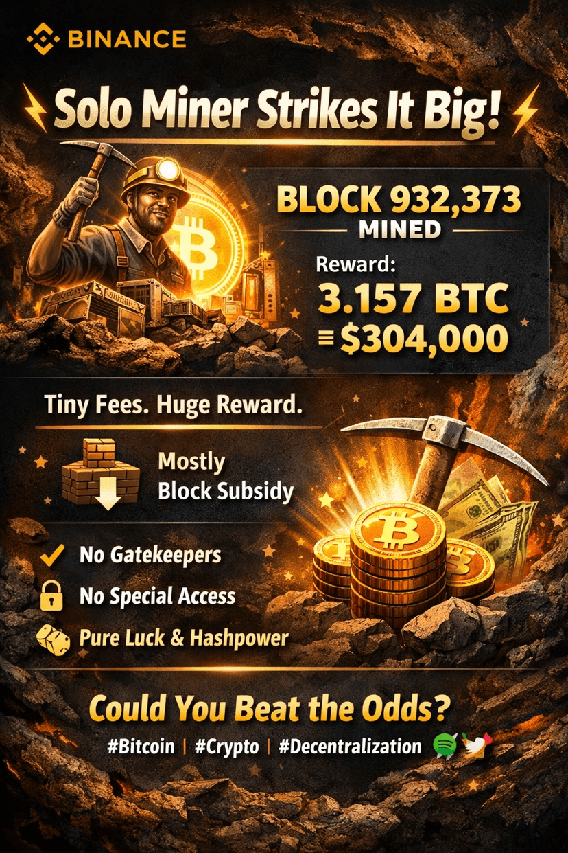 Przeciw wszelkim przeciwnościom, samotny górnik Bitcoin właśnie zweryfikował Blok 932,373, zarabiając 3.157 $BTC około 304 tys. USD przy obecnej wartości rynkowej. ⛏️💥