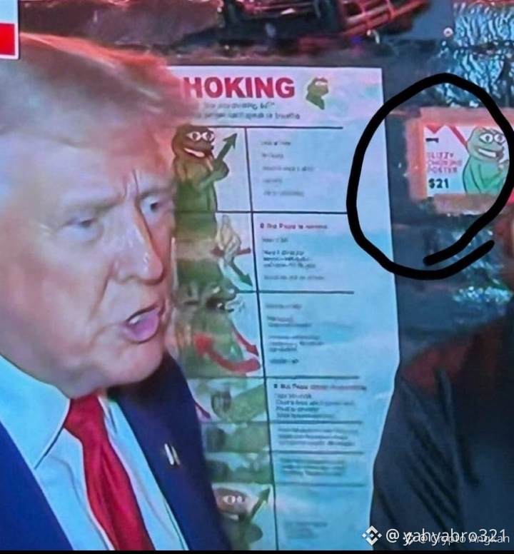 A viral image circulating on social media and Binance Square shows Donald Trump with what appears to be Pepe-the-Frog posters in the background. Some users are claiming this image proves that Trump is secretly promoting Pepe Coin or that Pepe has political backing.