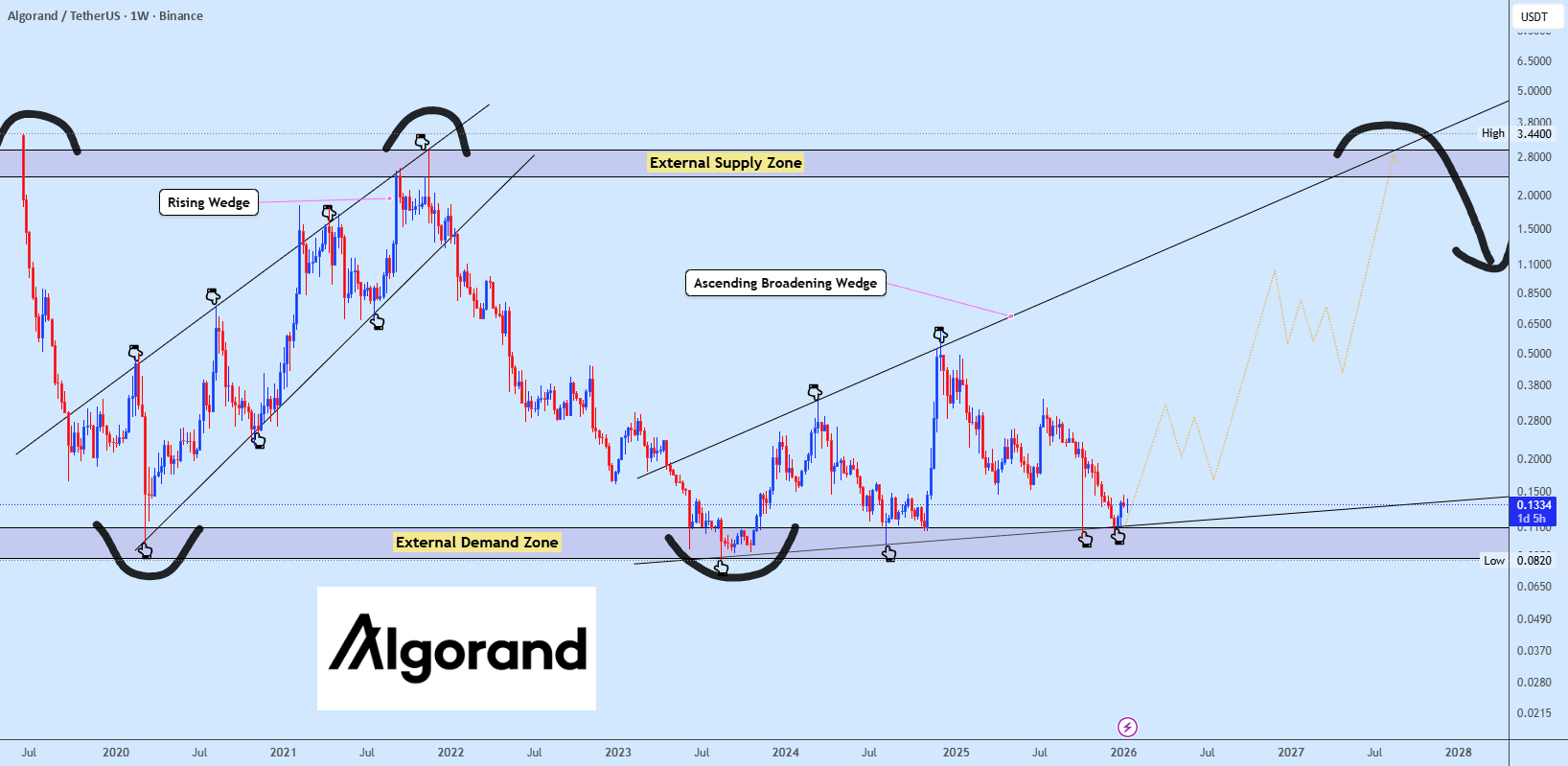 ALGOUSDT doświadczył załamania w formacji rosnącego klina, co spowodowało ostry spadek, prawie testując podstawę klina i wchodząc w strefę zewnętrznego popytu. Cena zareagowała silnie z tego obszaru i od tego czasu przeszła w rosnący szeroki klin, który pozostaje aktywny. Oczekiwany jest jeszcze test wzoru.