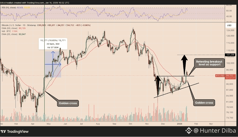 Bitcoin yeroo dhiyootti $100,000 akka deeggarsaatti deebisee qabachuu fi achii gara $107,000tti ol kaʼuu dandaʼa; kunis mallattoo teeknikaa fi bu’uuraalee (fundamentals) jaboo taʼan walitti makamuun deeggaraa jiru.