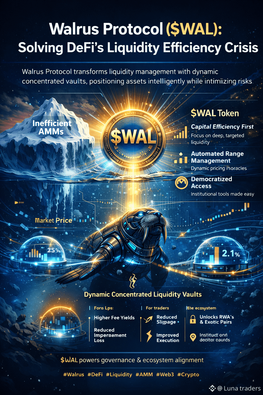 This is where @Walrus 🦭/acc introduces a powerful shift in how liquidity should work. Instead of letting capital sit idle, Walrus focuses on intelligent, automated liquidity concentration. Through its Dynamic Concentrated Liquidity Vaults, liquidity is continuously positioned where market activity actually happens. This means deeper liquidity, better execution, and smarter capital usage — all without forcing users to manually rebalance positions.