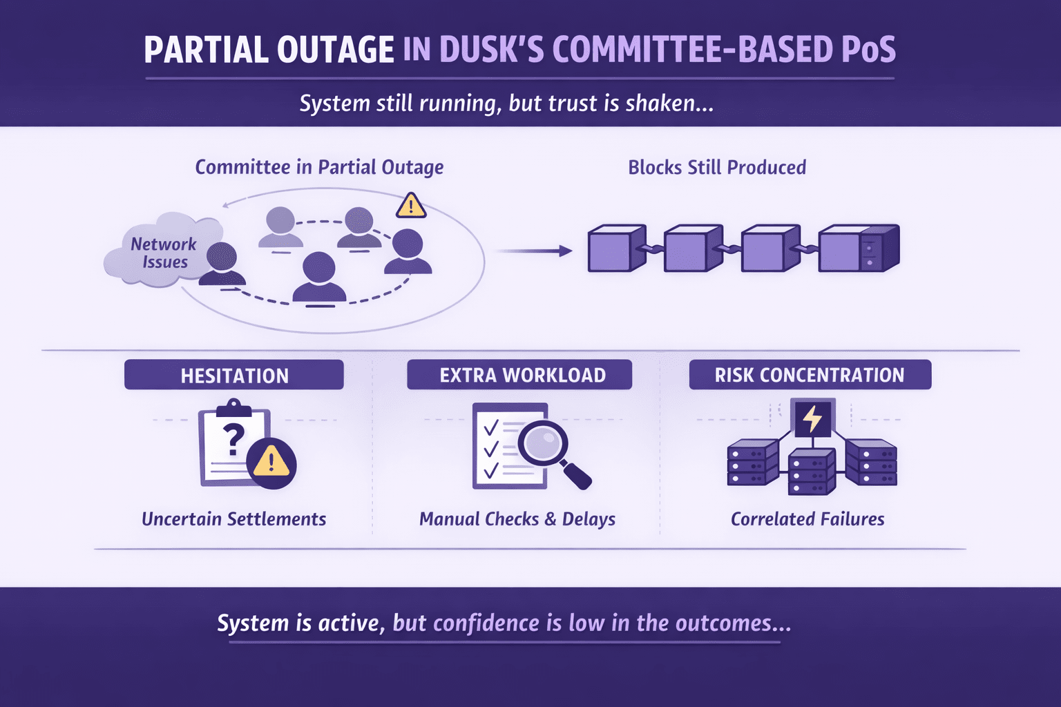 To jest miejsce, w którym oparta na komitetach metoda dowodu stawki Dusk staje się prawdziwą historią operacyjną. W idealnych warunkach komitety są wydajne. Redukują liczbę uczestników potrzebnych do osiągnięcia zgody, dzięki czemu wyniki przychodzą szybko i przewidywalnie. Dokładnie tego chcą regulowane rynki: nie tylko szybkości, ale czystego zakończenia. Problem polega na tym, że częściowa awaria atakuje jedną rzecz, którą komitety mają zapewnić — wiarygodną koordynację.