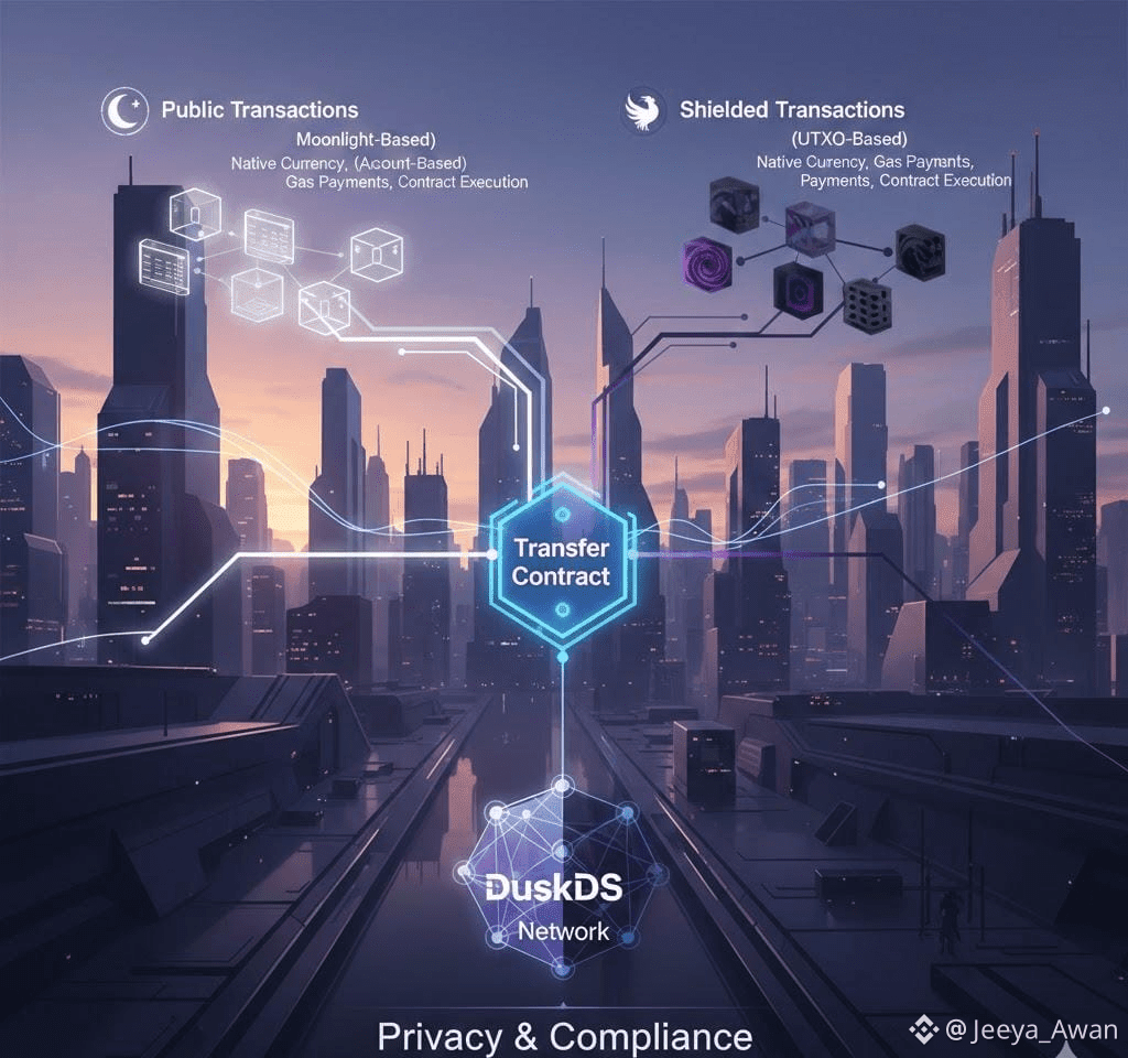 Transactions in DuskDS are managed by the Transfer Contract. The Transfer Contract oversees the handling of both transparent and obfuscated transactions within the network.