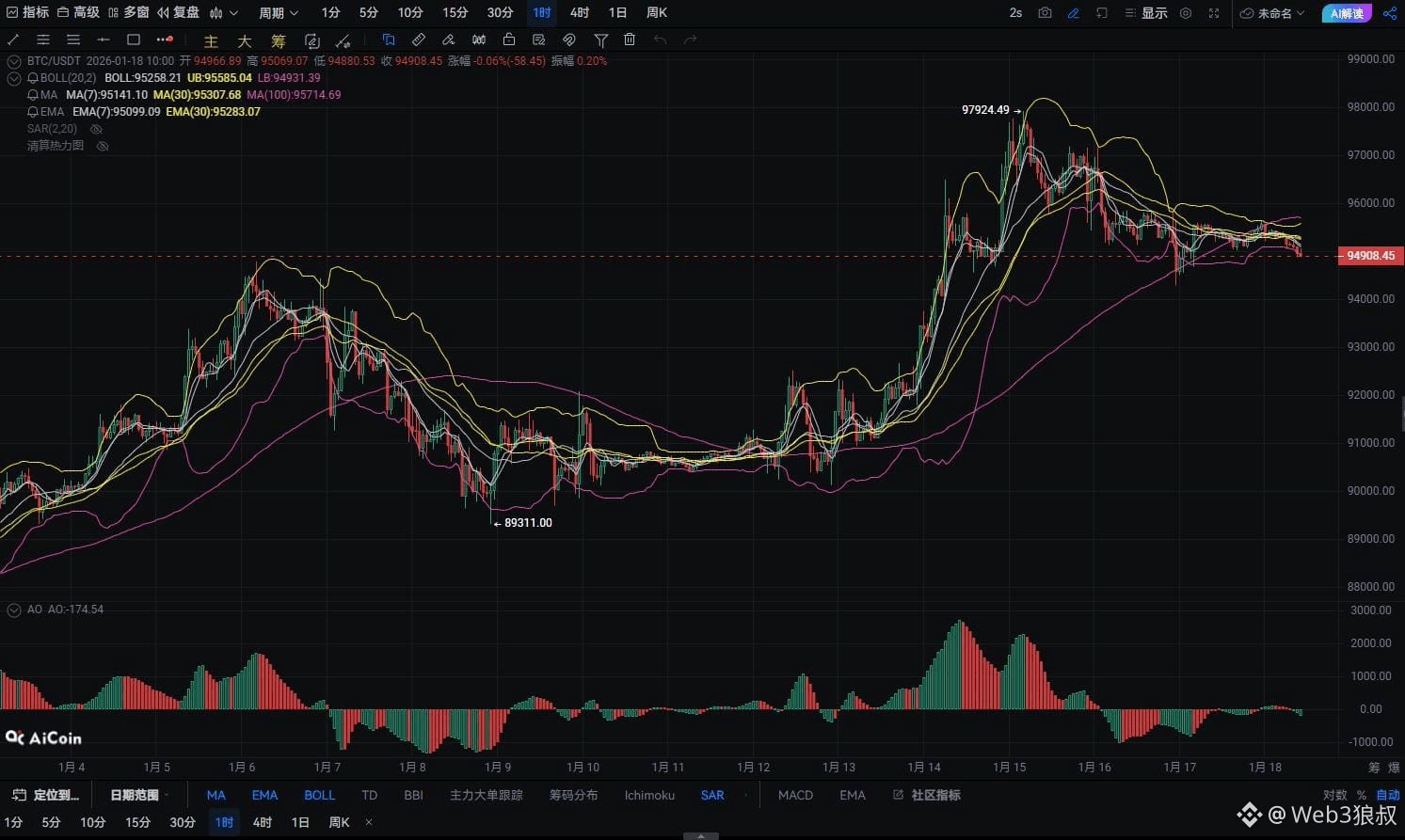 当前价格 94950,下方的第一个支撑位位于 94,000 附近,这是前期的震荡区间底部,同时也是布林带中轨附近的位置。若价格跌破此支撑位,则可能会进一步下探至 93,000 区域。