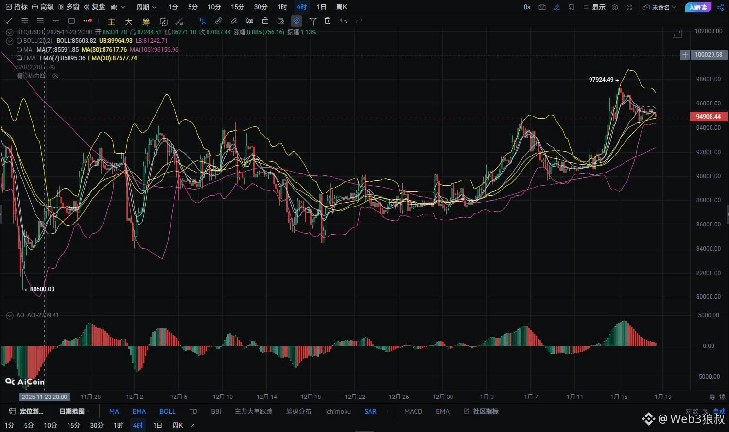 动能指标(如MACD、AO)显示当前短期上涨的动能有所减弱,但依然保持在一个较强的位置。如果下方支撑位有效,回调后可继续考虑做多。