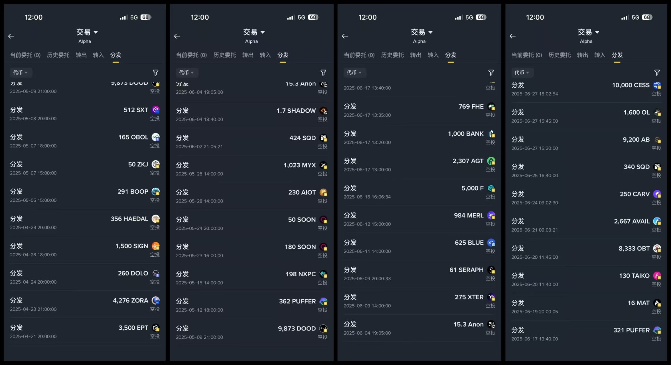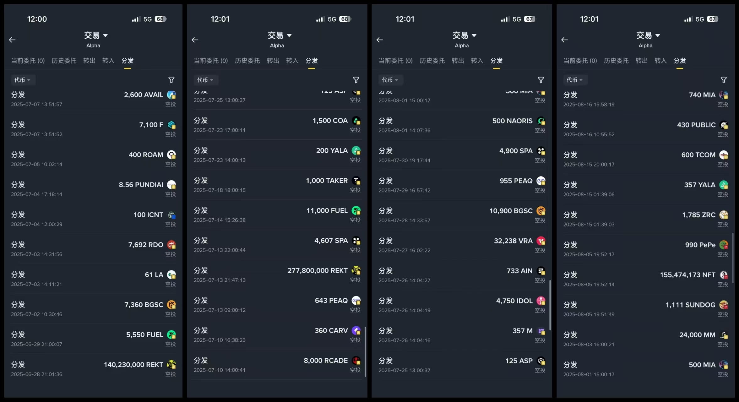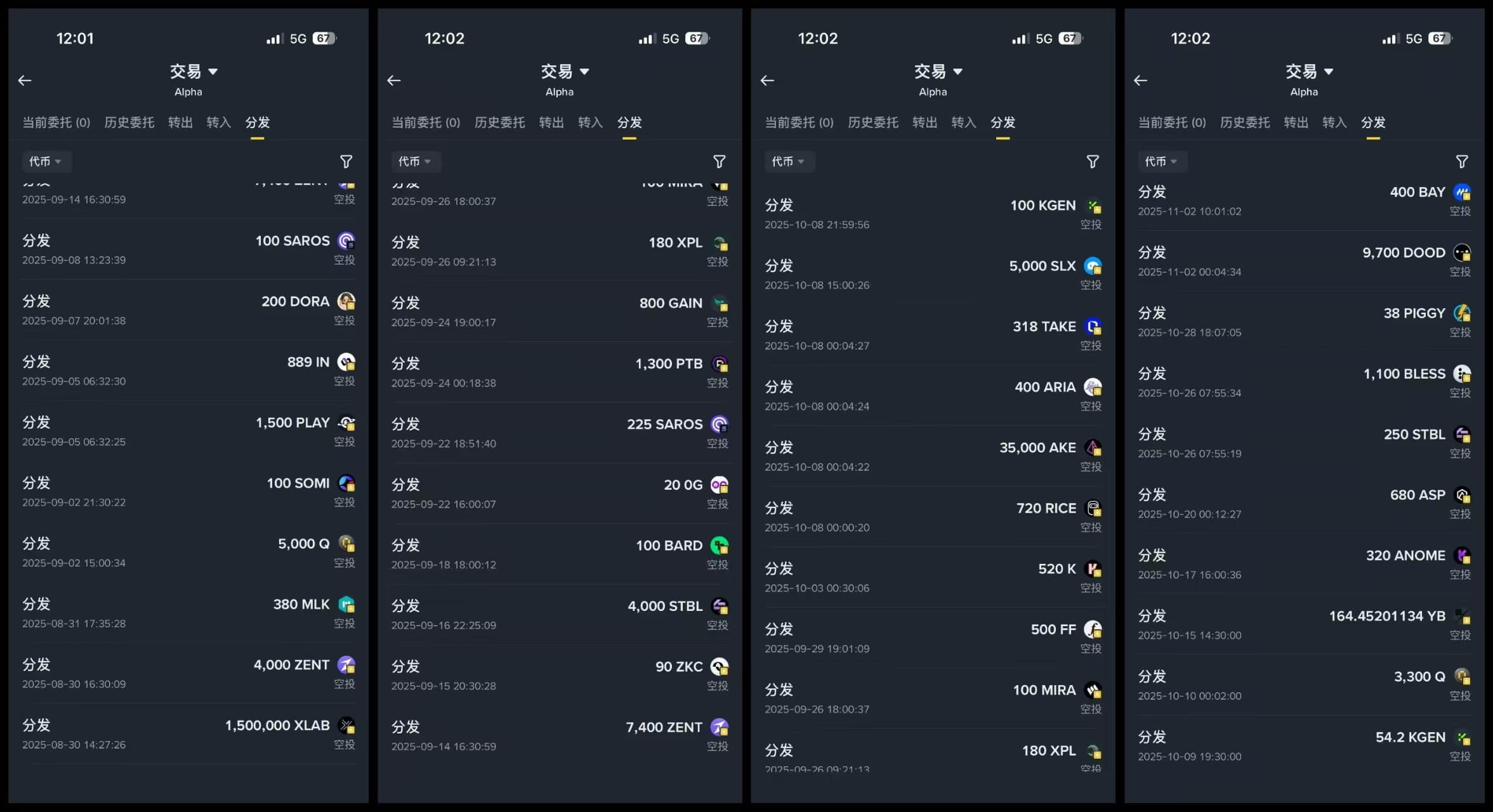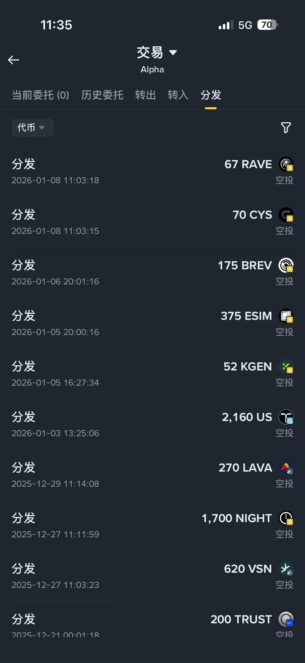 Dziś jest 18 stycznia 2026 roku. Spojrzałem na zyski alpha za styczeń i mogę to tylko opisać jako marny. Otrzymałem tylko dwa airdropy, ponieważ deprecjacja w konkursie handlowym ledwo pokrywa codzienne koszty dotyczące alpha. Możesz zobaczyć mój zrzut ekranu, po 21. daty były tylko dwa airdropy, które otrzymałem: esim i brev, inne to nagrody za doładowania lub konkurs handlowy. To znaczy, że w ciągu miesiąca otrzymałem tylko dwa, nie brałem udziału w fogo, myślałem, że obstawienie 350 milionów nie ma dużej wartości, nie spodziewałem się, że rynek spot zacznie się dobrze, chociaż teraz już spadł poniżej ceny emisyjnej. Dlatego w tym miesiącu mój zysk wynosi 100U, a to i tak w przypadku, gdy brałem udział w konkursie handlowym. Dla przyjaciół, którzy nie brali udziału w konkursie, sądzę, że konto na 1000U ledwo wróci do równowagi.