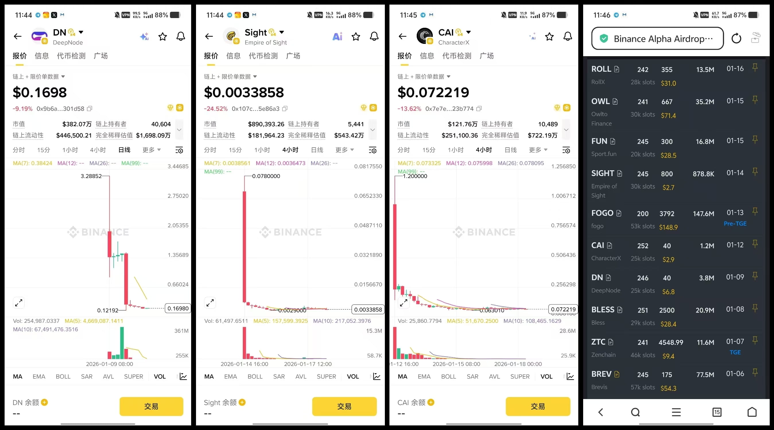Patrząc na wcześniejsze airdropy i stablecoiny. Najpierw mówiąc o airdropach, DN, SIGHT, CAI, trzy wielkie imiona, na otwarciu nauczyły nas o wartości, która obecnie wynosi mniej niż 10 U, co jest korzystne dla długoterminowych strategii.