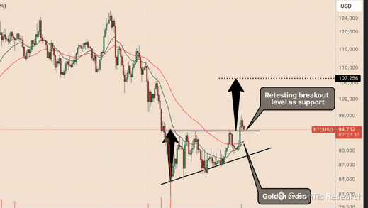 🔸$BTC đã vượt mô hình tam giác tăng dần và retest thành công vùng 95.000 USD, các đường trung bình động EMA 20 và 50 ngày sắp giao cắt tăng giá, tín hiệu thường kích hoạt những cú nhảy vọt