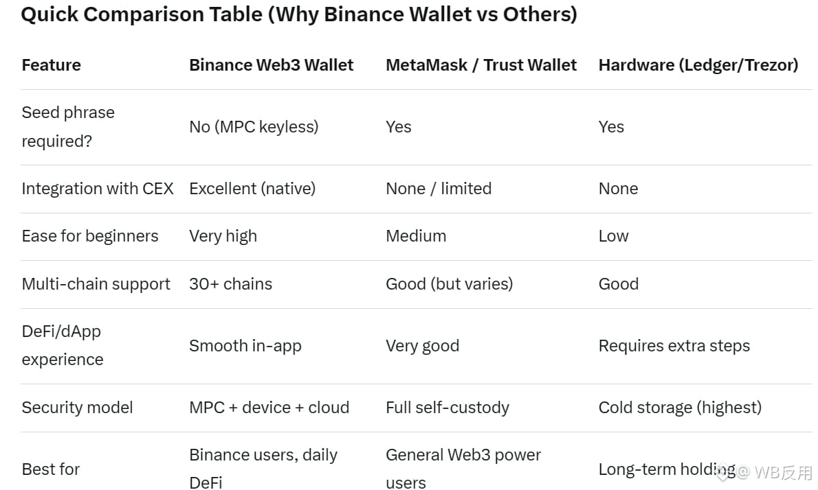 Quick Comparison Table (Why Binance Wallet vs Others)FeatureBinance Web3 WalletMetaMask / Trust WalletHardware (Ledger/Trezor)Seed phrase required?No (MPC keyless)YesYesIntegration with CEXExcellent (native)None / limitedNoneEase for beginnersVery highMediumLowMulti-chain support30+ chainsGood (but varies)GoodDeFi/dApp experienceSmooth in-appVery goodRequires extra stepsSecurity modelMPC + device + cloudFull self-custodyCold storage (highest)Best forBinance users, daily DeFiGeneral Web3 power usersLong-term holdingBottom Line (in 2026)Choose Binance Wallet if: