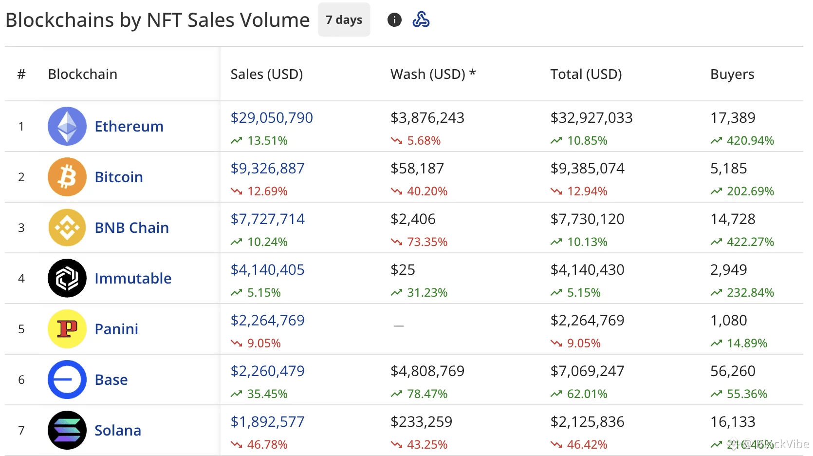 Ethereum topped all blockchains with $29.05 million in NFT sales 💎, a 13.5% increase. It attracted 17,389 buyers 👥, up 421% from the prior week. Wash trading on Ethereum accounted for $3.88 million.