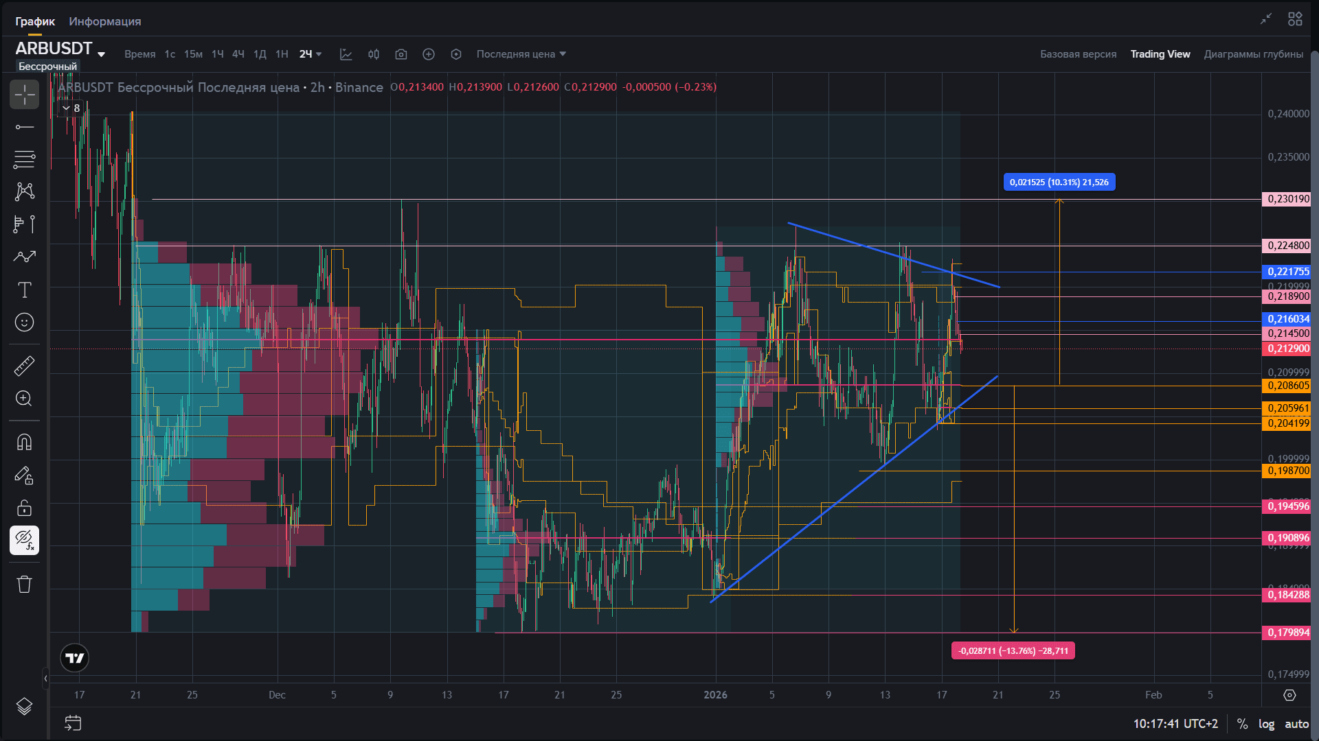 Baza: rynek nadal żyje wewnątrz symetrycznego trójkąta i w strefie akumulacji 0.179894–0.203190 jako fundamentalna „dolna komora”.