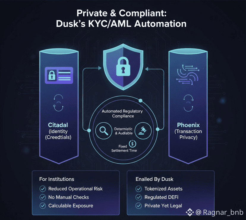 Automated compliance logic in Dusk is achieved through a combination of smart contracts, cryptographic proofs, and identity integration via Citadel: