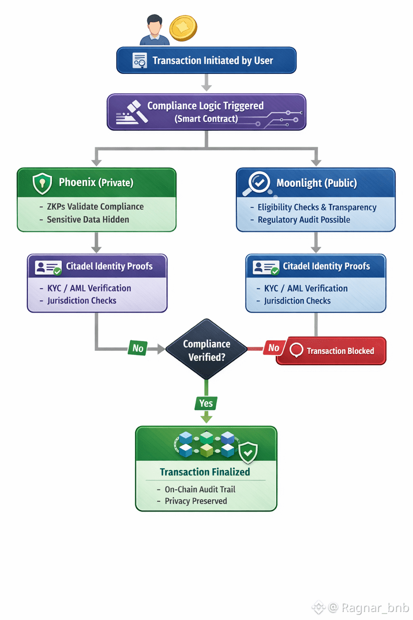 The Dusk Network’s dual transaction model—Phoenix (private) and Moonlight (transparent)—relies on automated compliance logic: