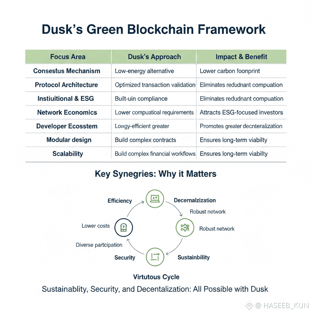 Dusk approaches this challenge differently. Its design philosophy integrates energy efficiency directly into the network, demonstrating that security, decentralization, and sustainability can coexist. In Dusk, energy efficiency is not a compromise—it is a foundational principle that shapes every layer of the protocol. From consensus mechanisms to transaction processing, the network is built to maximize utility while minimizing environmental impact, making it a natural choice for ESG-focused participants.