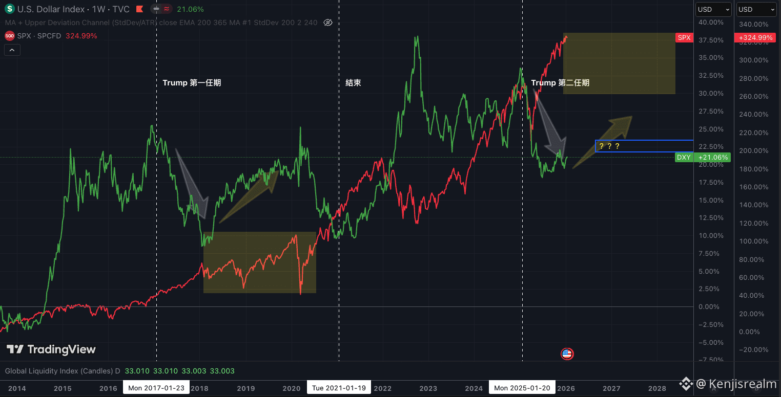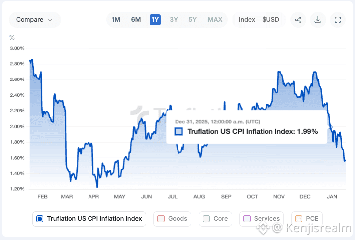 同時,利率市場也將今年可能兩次超預期降息至 3% 以下的看法小幅調升至 3.25% ~ 3%(如圖二),這將對風險資產形成壓力,美元與美債利率曲線也相應抬升。這不僅讓人想起川普第一任期時,美元在任期第一年時快速下跌後開始回升(可見圖三),而這有多大可能性?!個人認為不大,唯一可能是 Warsh 鷹派就任,通膨持續高企。而就目前 Truflation 最新數據來看(如圖四),目前實時 CPI 已經掉到 1.58%,值得注意的是在去年底 Tru CPI 就已經降至 2% 以下,也就是說今年三月開始的通膨數據應該會反映下降的情況,這無疑會加強降息的預期。