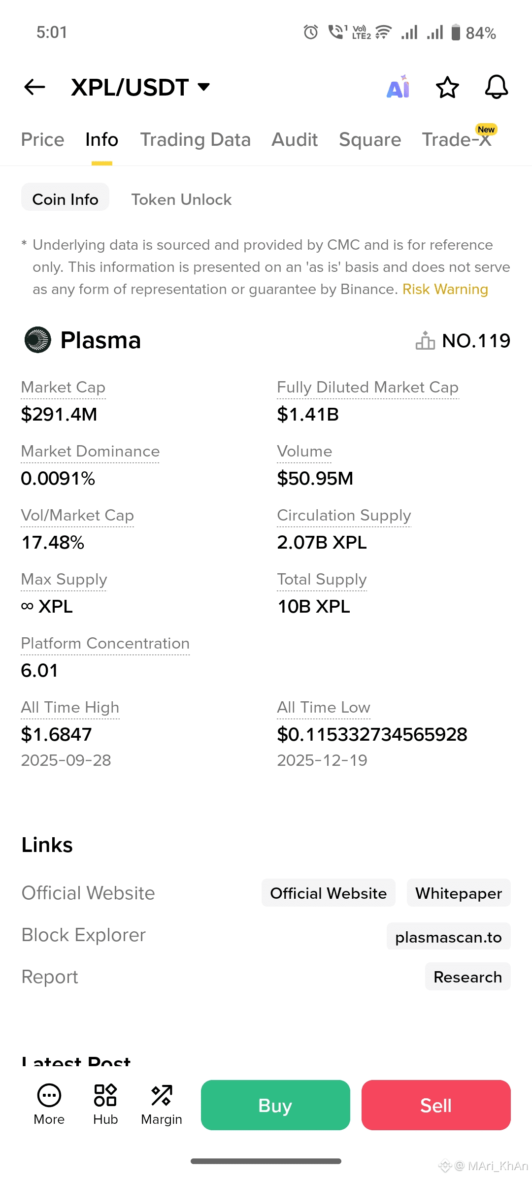 Many people only look at price, but with @Plasma the real story is in the numbers. $XPL currently has around 2.07B tokens in circulation out of a total supply of 10B. This means not all tokens are unlocked yet, which is important for anyone thinking long term. Market cap is close to $300M, and daily trading volume stays strong above $50M, showing that interest in Plasma is still active.