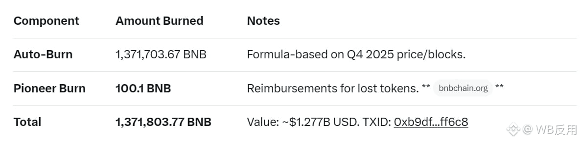Latest Update: 34th Quarterly BNB Burn (Jan 15, 2026)Just 3 days ago, BNB Foundation completed its first burn of 2026 (34th overall), destroying 1,371,803.77 BNB (~$1.277 billion USD at burn time). bnbchain.org