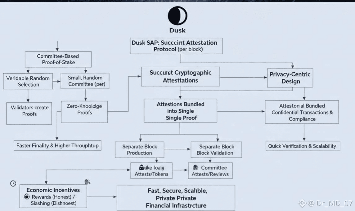 Dusk Network aims to power confidential financial applications, so it needs a consensus layer that’s fast, secure, and tough to manipulate. Most blockchains struggle to hit all of these marks at once. That’s why Dusk developed the Succinct Attestation Protocol SAP for short a consensus system that pulls together efficiency, cryptographic security, and real accountability for validators.