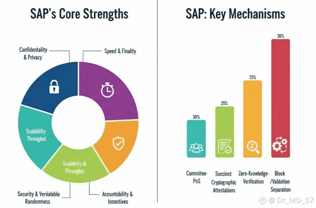 One thing that sets SAP apart is its use of succinct cryptographic attestations. Committee members who validate a block create digital attestations these are cryptographic proofs showing the transactions are sound and the block structure holds up. The network then bundles these attestations into a single, compact proof, which everyone else can quickly check. This keeps data lean and bandwidth low, so the network can scale up without watering down security.