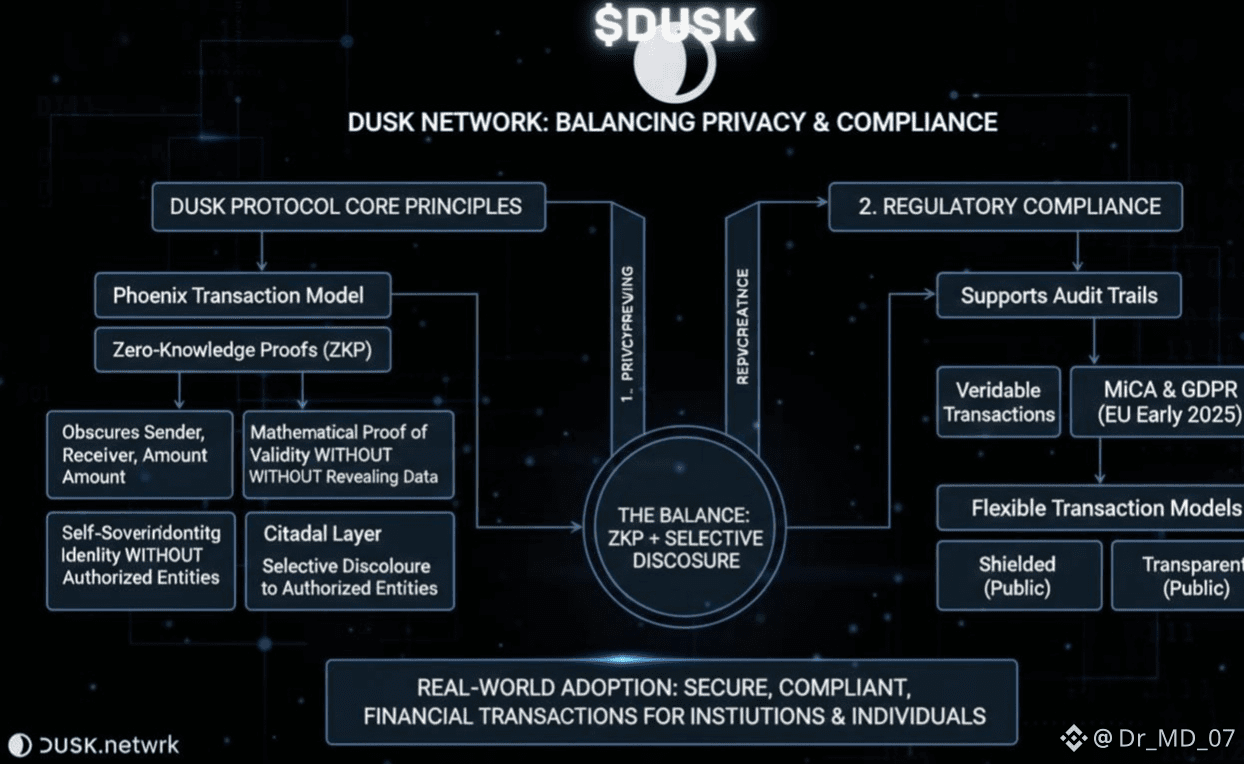 From a professional perspective, these design decisions make Dusk extremely relevant right now. In early 2026, regulatory frameworks like MiCA in Europe are pushing for transparency and compliance, but they also recognize the need to protect individual data under laws like GDPR. Dusk’s architecture allows it to satisfy both demands a rare balance in blockchain technology. Many projects promise privacy but end up being too opaque for regulated use cases; others are transparent enough for compliance but expose too much data to suit everyday financial transactions. Dusk sits between these extremes with intentional design.