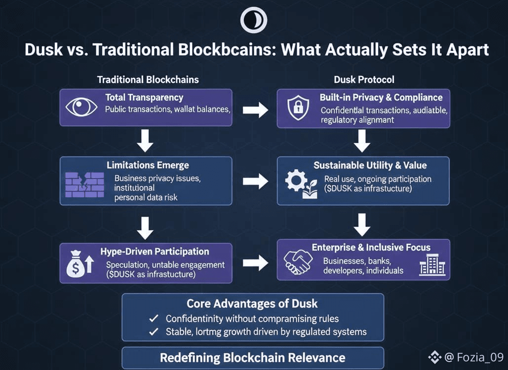 By putting privacy,steady utility,and real world compatibility first,the Dusk Foundation proves that blockchain innovation doesn’t have to be noisy to make an impact.DUSK matters because it’s part of something built to last,not just another flash in the pan.In that way,Dusk isn’t just different from traditional blockchains it’s redefining what makes a blockchain relevant at all.
