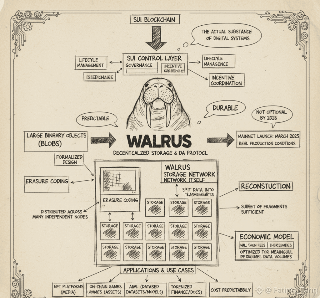 Walrus was introduced publicly by Mysten Labs in mid‑2024 as a decentralized storage and data availability protocol purpose‑built for large binary objects, or “blobs.” Rather than creating a new blockchain to coordinate storage behavior, Walrus uses Sui as its control layer, relying on Sui for lifecycle management, governance, and incentive coordination while focusing engineering effort on the storage network itself. This architectural separation is significant because it treats storage as a specialized system rather than forcing it to inherit the constraints of a general‑purpose execution layer.