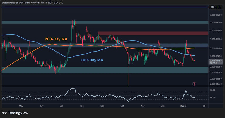Teraz, jeśli spojrzymy na walkę z Bitcoinem (XRP/BTC), sytuacja jest trochę bardziej trudna. XRP próbował pokazać muskuły przeciwko "Królowi", ale został brutalnie odrzucony w strefie 2400-2500 sats. Zasadniczo Bitcoin nadal rządzi i pokazuje, że ma większą wytrzymałość. Dopóki XRP nie zdoła przełamać i utrzymać się powyżej tej bariery, względna przewaga nadal należy do BTC. Spadamy w kierunku 2150 sats, a jeśli nie będzie szybkiej reakcji, następna podłoga jest na poziomie 2000 sats. 📉🦾