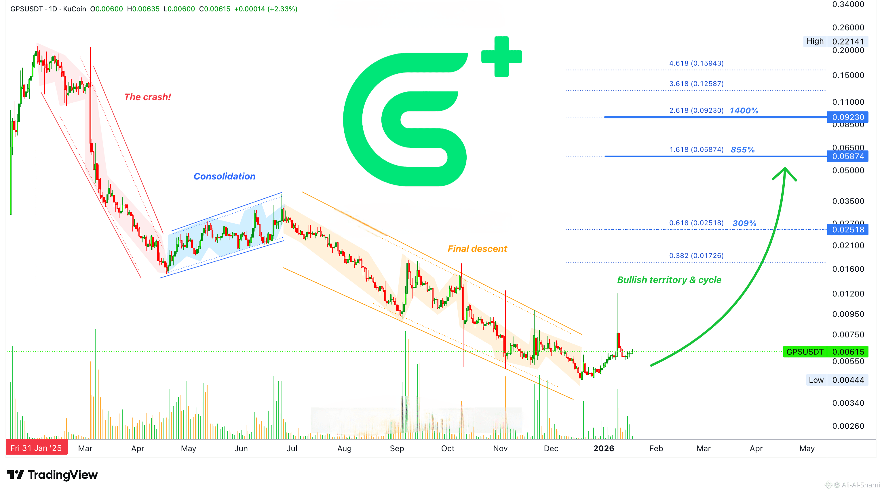ينتج GPSUSDT أول اختراق صعودي وحجم التداول دائمًا مرتفع؛ الكثير من الاهتمام والنشاط حول هذه الزوج. ثم كان لدينا تصحيح صغير، أربعة أيام فقط. من 9 إلى 13 يناير 2026 ونحن في المنطقة الخضراء مرة أخرى.