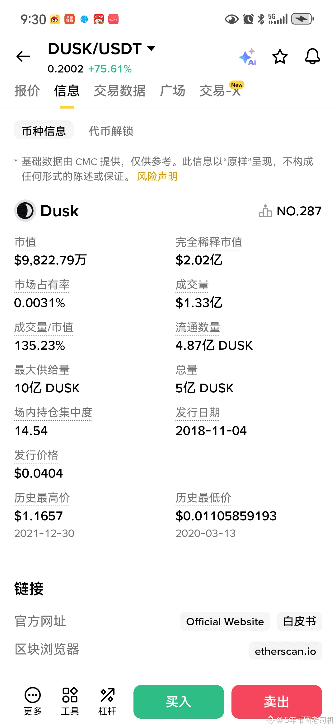 DUSK目前从最低点0.025U暴涨到0.2U,已经差不多10倍涨幅。