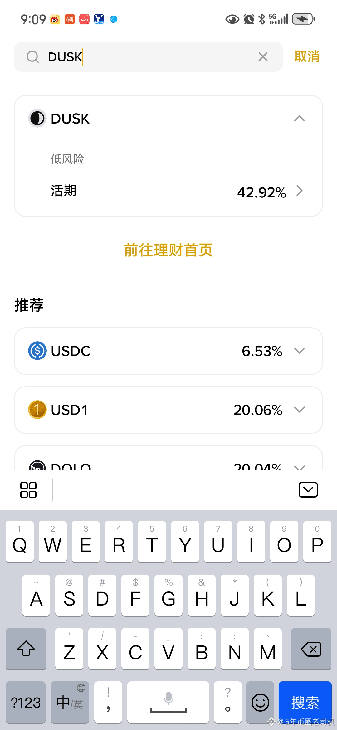 目前的币安理财已经达到了(42%)百分之四十二的理财收益。而且目前币安账户目前还可以有61万DUSK的理财名额。