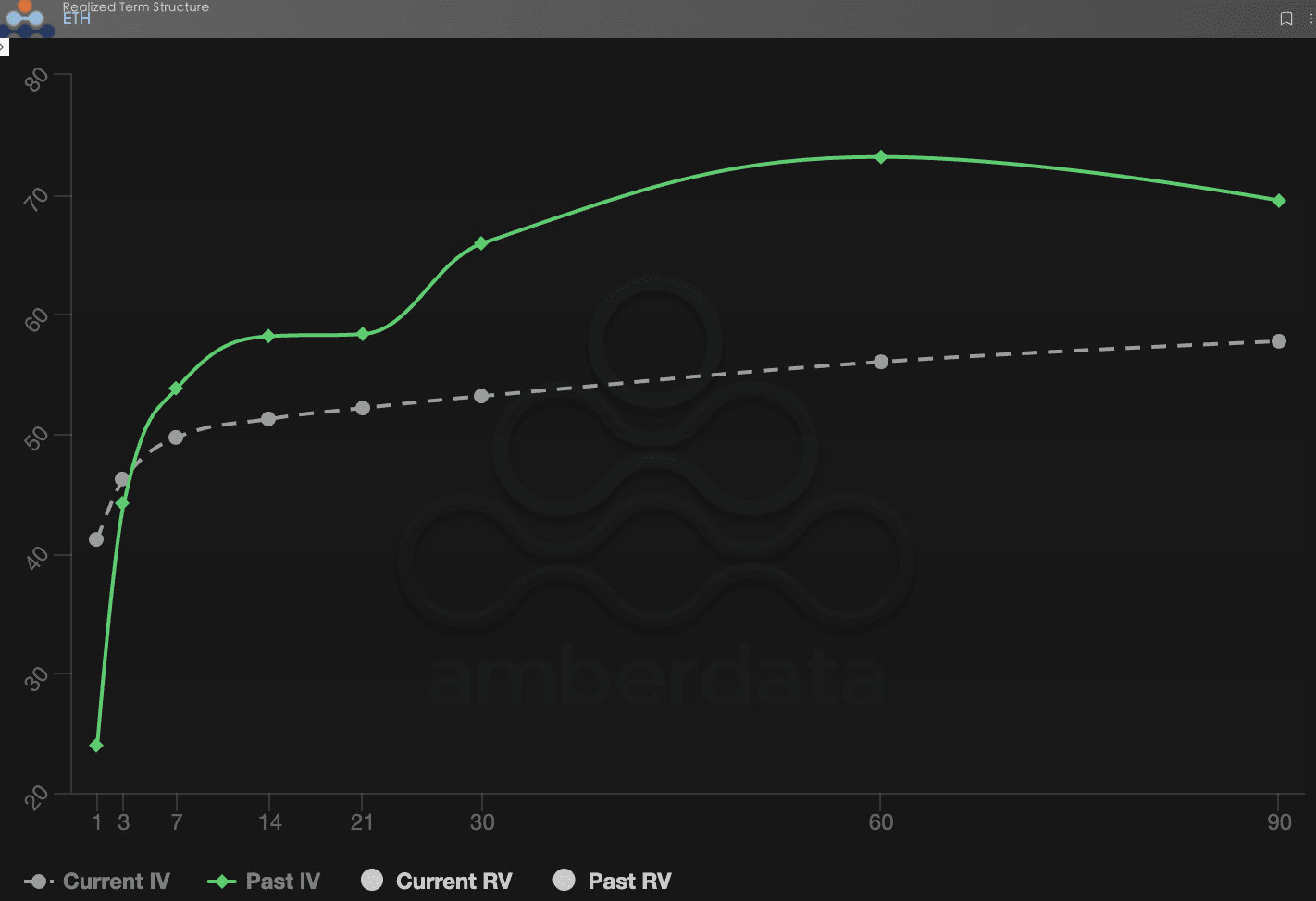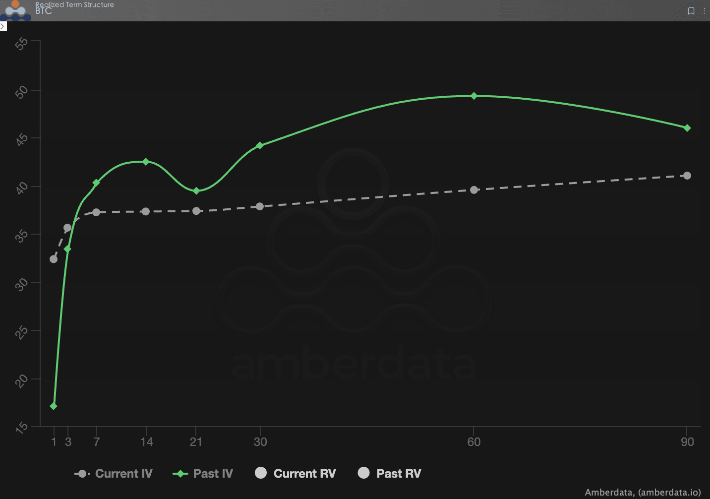 Korzystając z wykresów i danych dostarczonych przez Amberdata i Derive.XYZ, możemy zaobserwować, że struktura zmienności w tym tygodniu wykazuje wyraźne cechy „oczekiwania na przód, zmienność w tyle”. Mimo że makro hałasy są ciągłe, rzeczywista zmienność nie nadąża za wzrostem implied volatility.