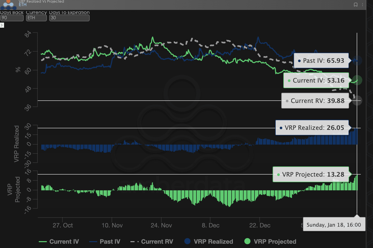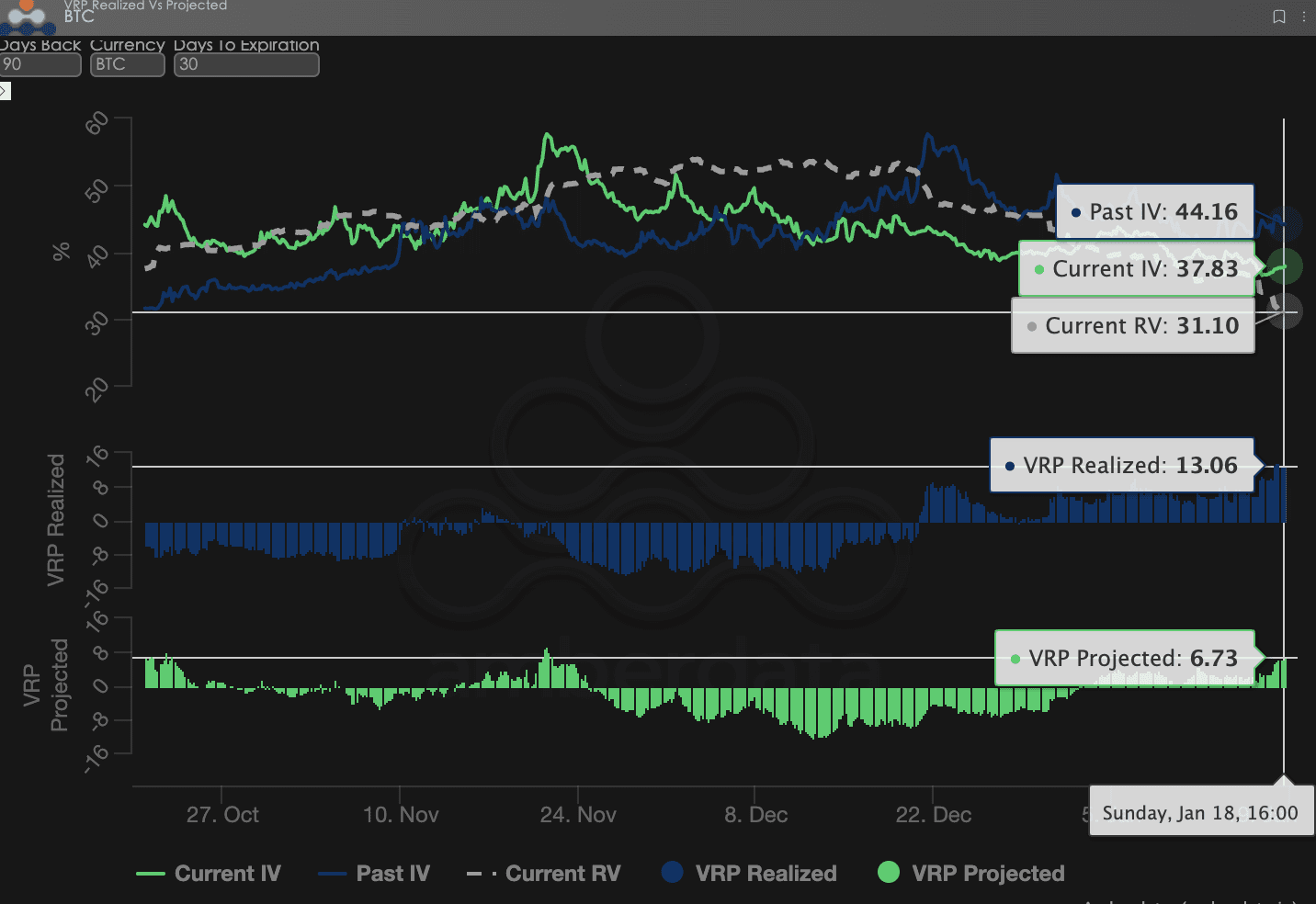 VRP (premia za ryzyko zmienności = implied volatility IV - realizowana zmienność RV) jest ważnym wskaźnikiem oceny, czy wycena opcji jest uzasadniona. Obecnie rynek znajduje się w fazie korekty.