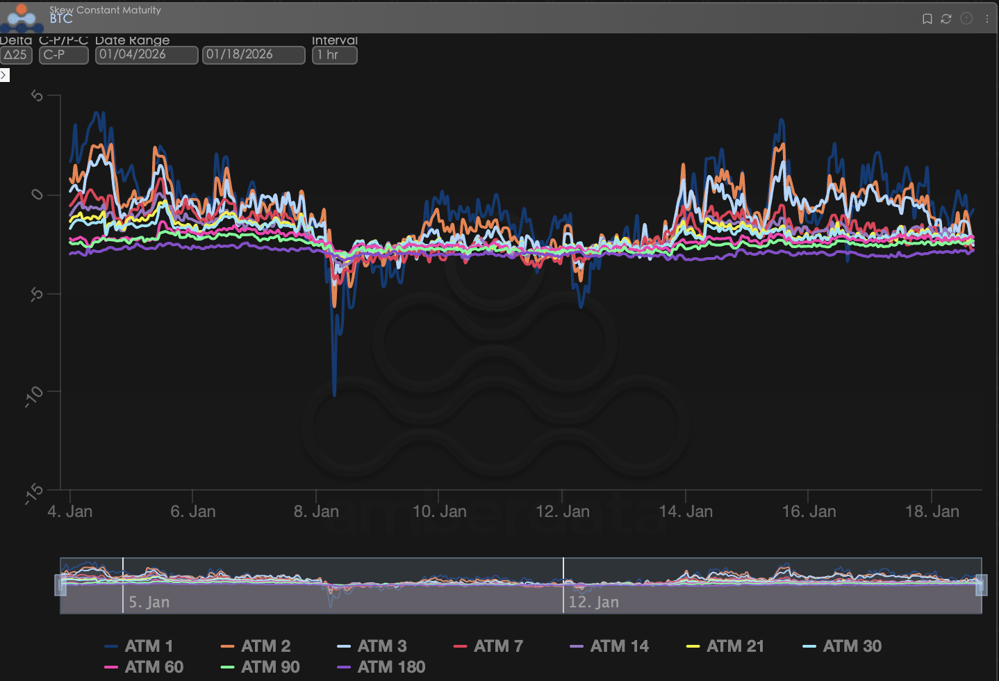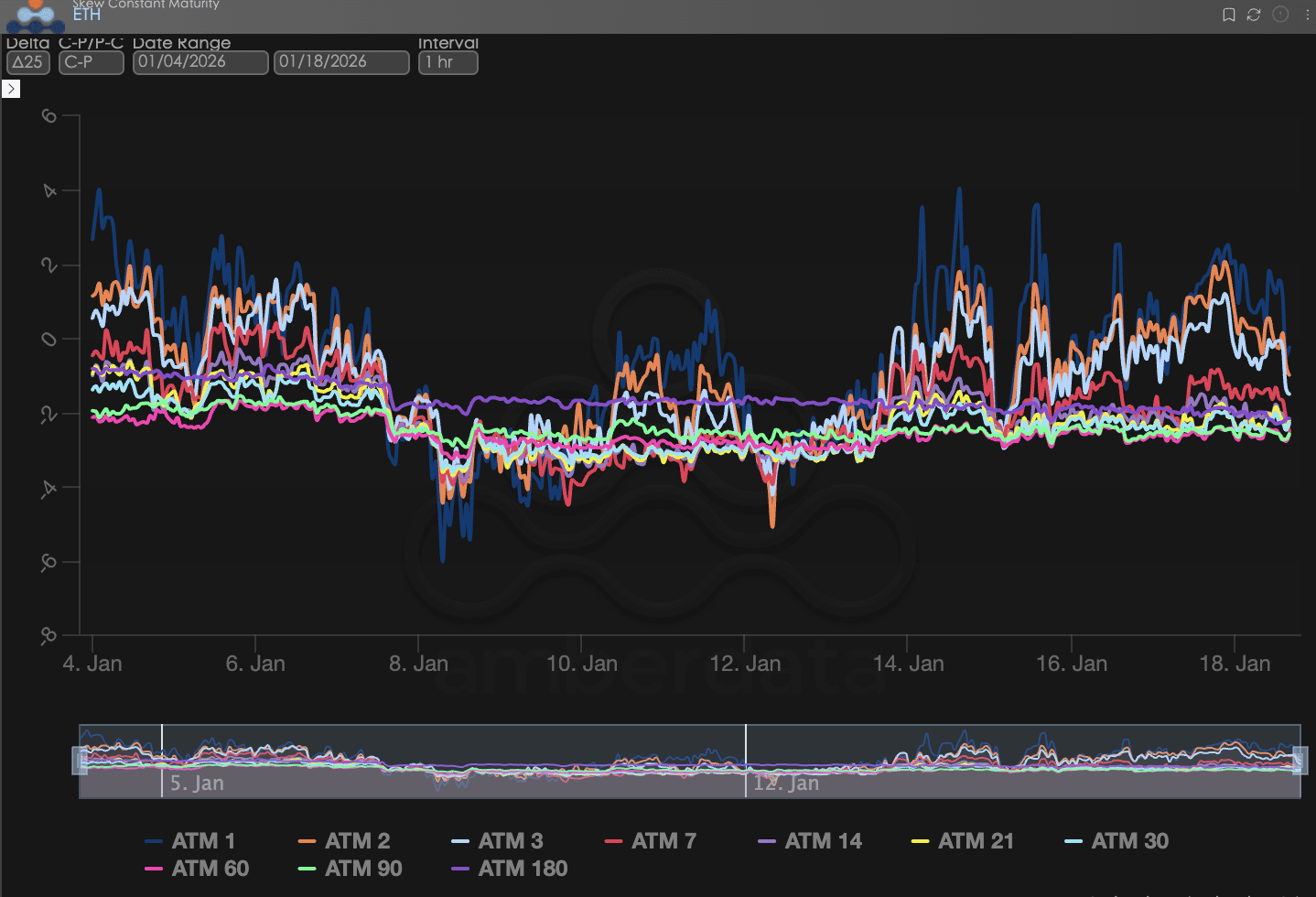 Krótki koniec (ATM 1-7): Głęboko niebieska linia (ATM 1) i czerwona linia (ATM 7) wykazują największe wahania. Obserwując dane z ostatnich dwóch tygodni (średnia godzinowa), krzywa Skew dla BTC wykazuje znaczący trend wzrostowy. Szczególnie dane z bliskiego końca wielokrotnie dotykały dodatnich wartości.