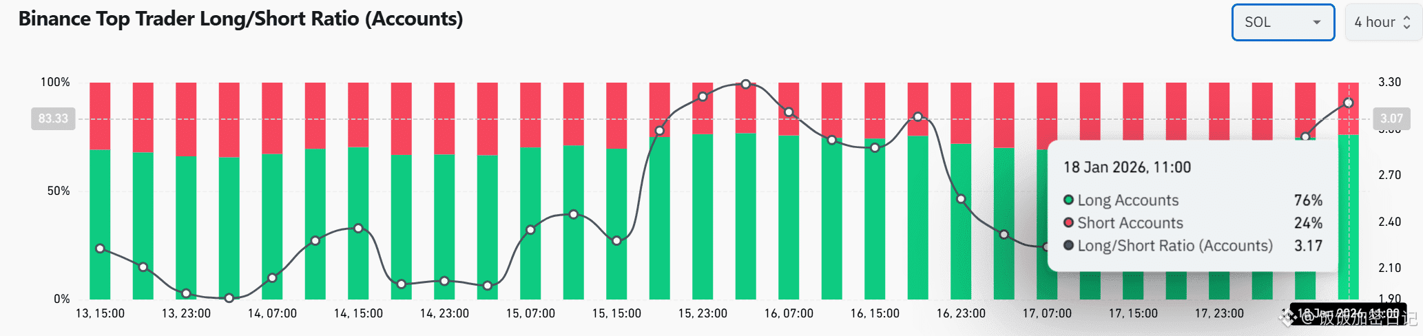 衍生品数据显示交易员偏向多头。币安顶级交易员多头持仓占 76%,空头仅 24%,多空比 3.17。这反映市场信心增强,但未出现过度拥挤。多头仓位是在技术突破后建立,走势与结构保持一致。若价格跌破 135.5 美元,多头可能迅速平仓,但目前仓位配置倾向于延续上涨。
