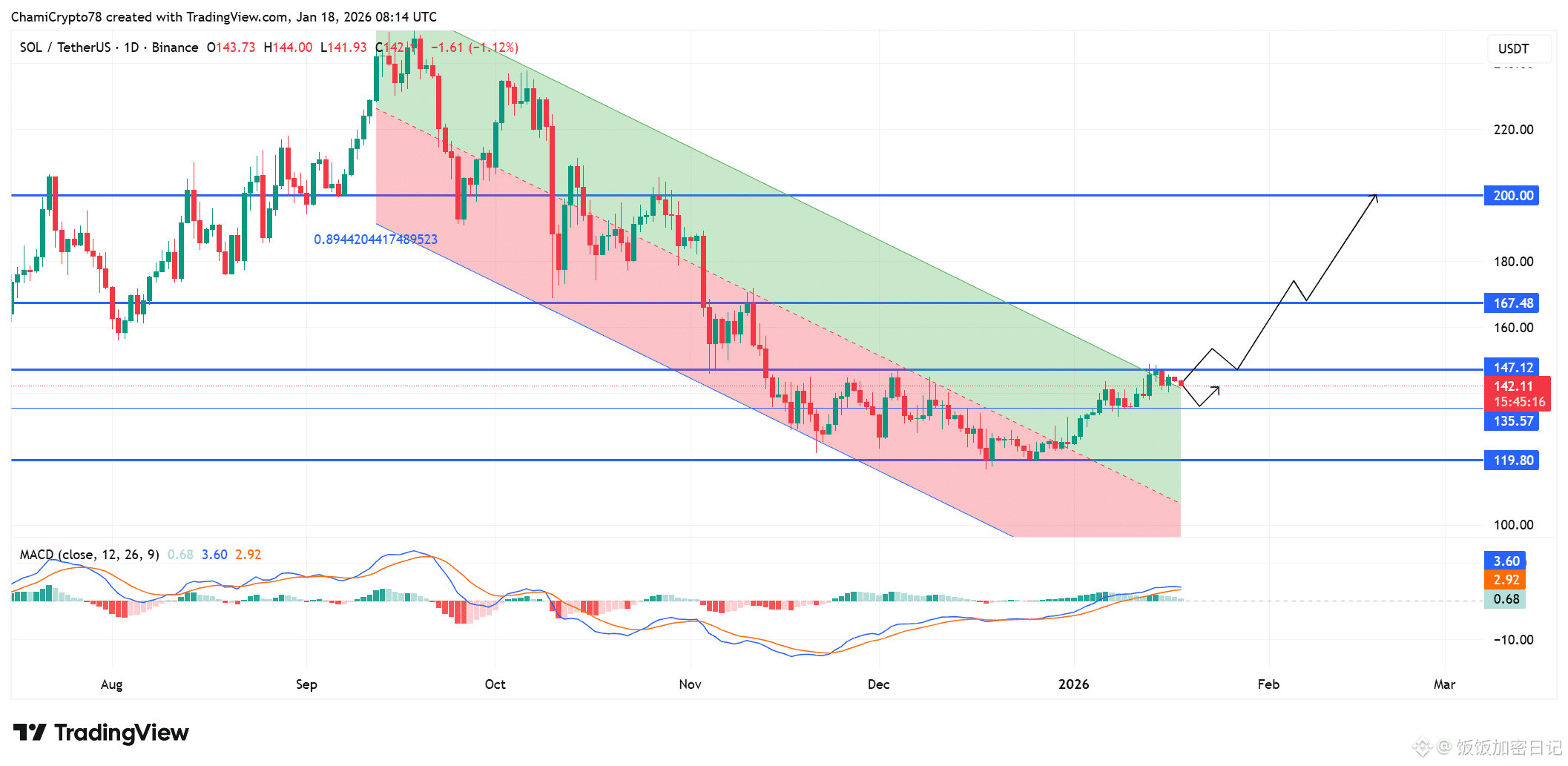 SOL 价格走势显示结构性转变,结束了数月下跌。买家守住了 119.8 美元低点,将价格推高至下降阻力位上方,重新站稳 135.5 美元至 147.1 美元区域,并将其转化为支撑。