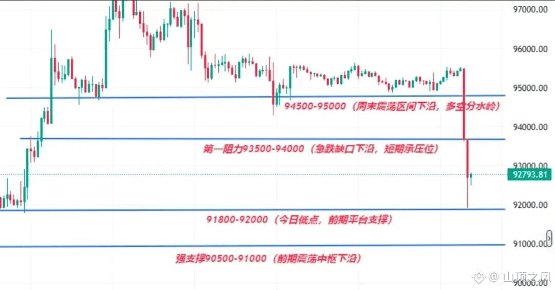 下方支撑:91,800–92,000 美元(今日低点区域)