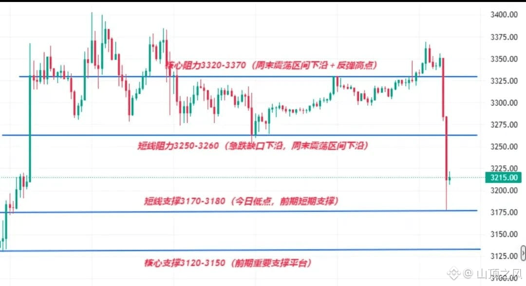 下方支撑:3,175–3,200 美元(今日低点 + 通道下沿)
