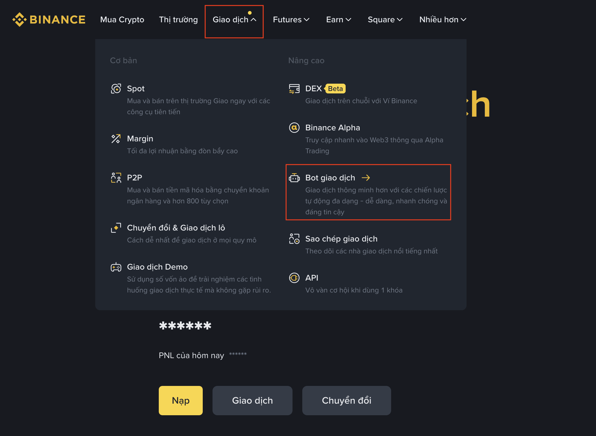 Cách truy cập Bot giao dịch trên Binance
