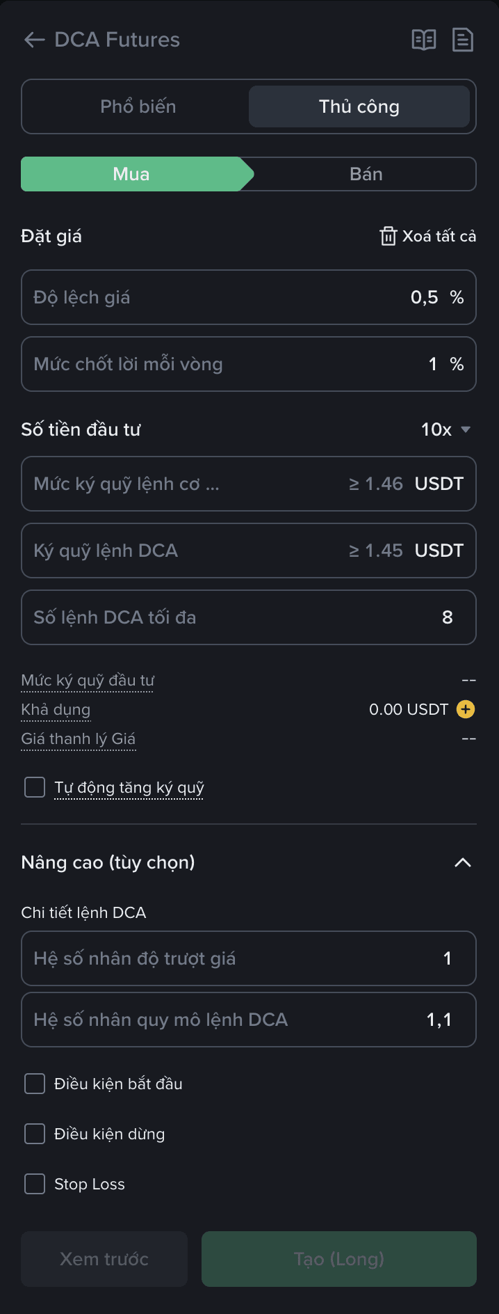Nâng cao: Hệ số nhân độ trượt giá và Hệ số quy mô lệnh DCA. Đây là 2 khái niệm nâng cao và mình xin phép sẽ giành một bài viết để giải thích một cách cặn kẽ hơn.