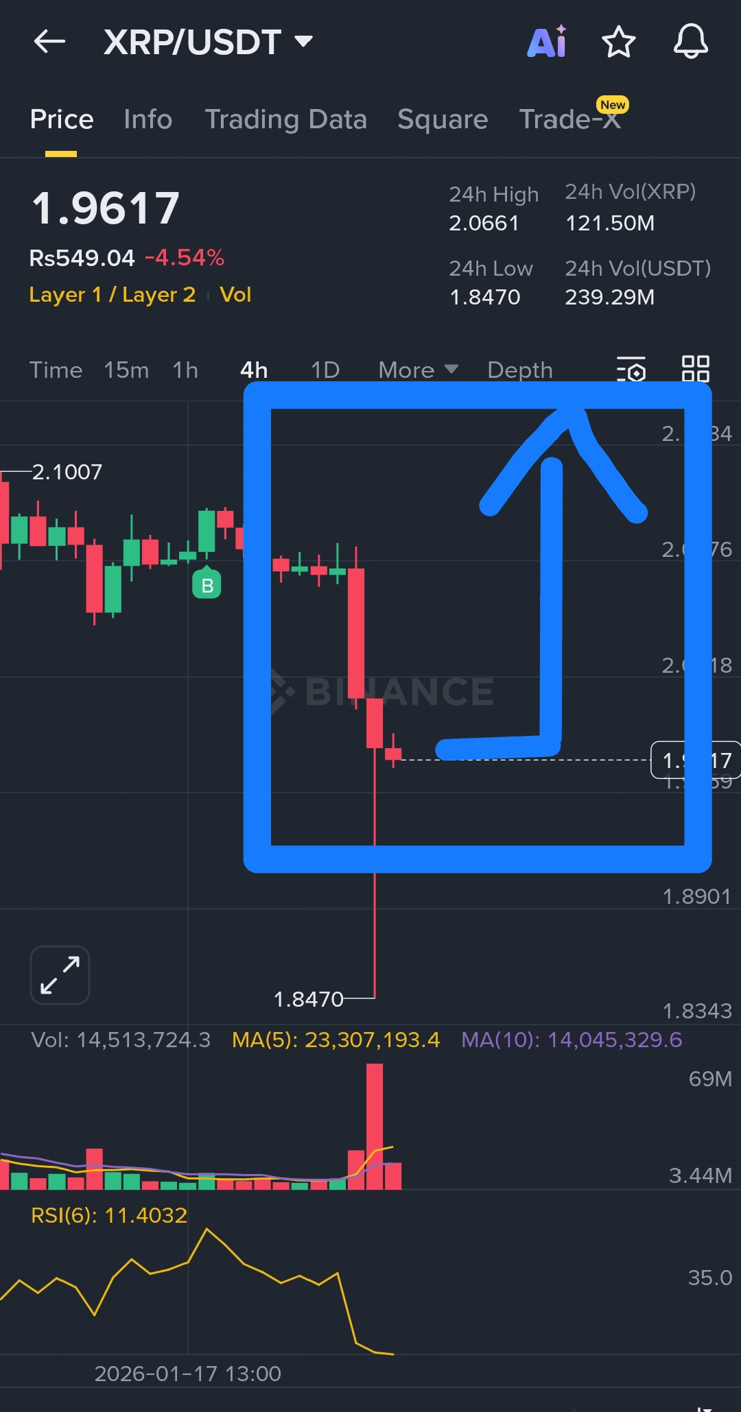 Patrząc na wykres, który dostarczyłeś, $XRP osiągnął 24-godzinne minimum na poziomie 1,84 USD, ale już pokazuje oznaki stabilizacji w okolicach 1,96 USD.