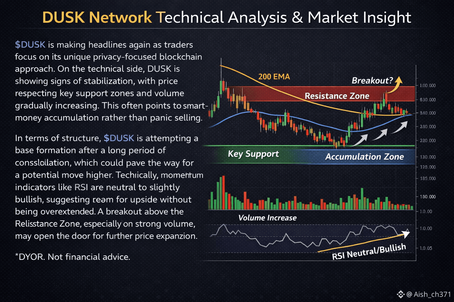 From a technical perspective, $DUSK has recently shown signs of structural stabilization after extended consolidation. Price action suggests the formation of a base, often associated with accumulation phases. Traders are closely monitoring key support zones where buying interest has repeatedly appeared. Volume behavior during these zones indicates participation rather than panic selling, which is generally a constructive signal.