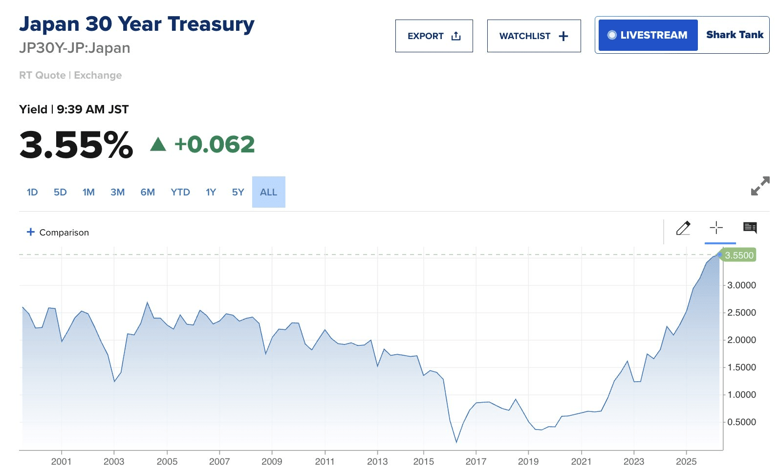 Rentowność 30-letnich obligacji rządowych Japonii wzrosła do najwyższego poziomu w historii wynoszącego 3,58% dzisiaj. Ponadto, rentowność 10-letnich obligacji rządowych Japonii wzrosła do 2,24%, osiągając najwyższy poziom od 1999 roku.