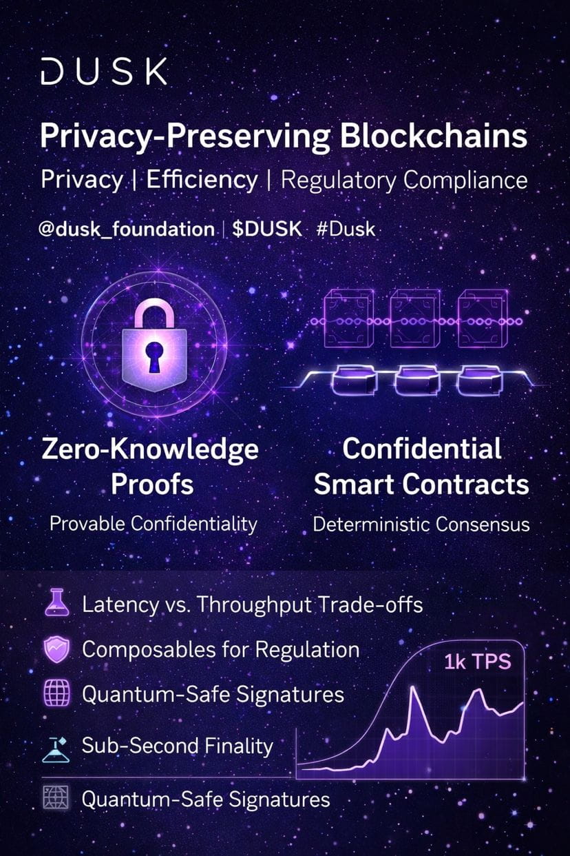 @dusk_foundation presents a scientific roadmap for privacy-preserving blockchains: leveraging zero-knowledge proofs and confidential smart contracts to enable provable confidentiality, deterministic consensus, and auditability without exposing payloads. We quantify latency vs. throughput trade-offs, model attacker surfaces, and propose composable primitives for regulatory compliance. $DUSK #dusk 🧪🔒📈🌐 Preliminary results show sub-second finality at 1k TPS with proof aggregation; ongoing work addresses quantum-safe signatures and a gas-efficient zkVM.@Dusk