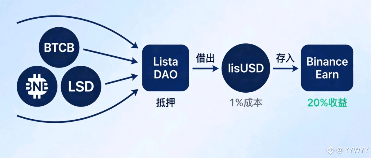 老铁们,稍微动动脑子算笔账:你根本不需要卖掉你珍贵的 BTCB 或 BNB,只需要把它们抵押进 Lista,按 1% 的利息借出 lisUSD,转手换成 USDT 存进币安吃 20% 的利息。这中间 19% 的利差,就是市场给认知变现者的奖赏。无论外面行情怎么跌,这笔现金流是雷打不动的,甚至足够覆盖你现货回撤的损失。