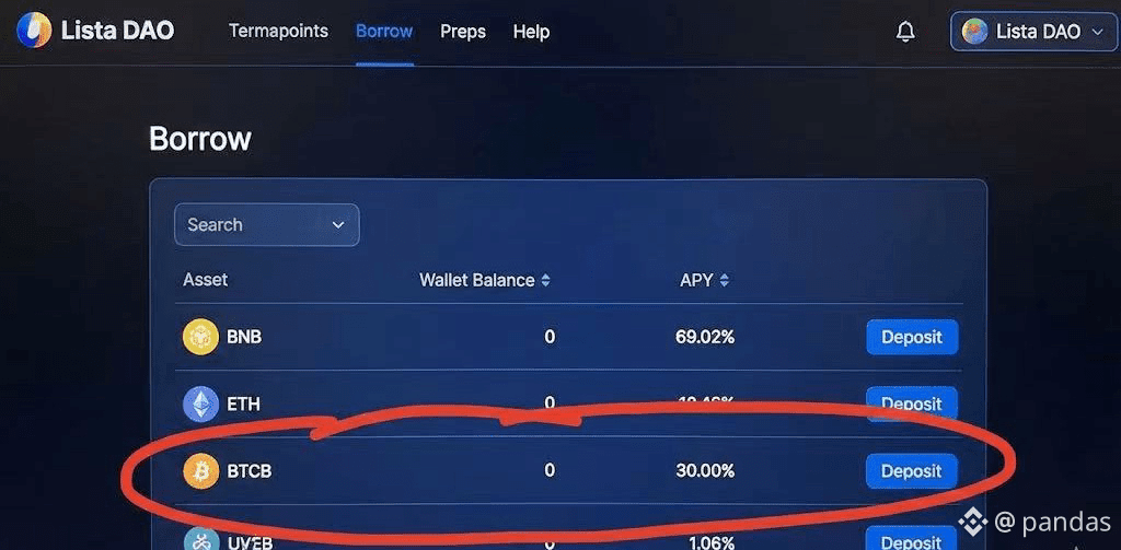 操作: 点击界面上的【Borrow】(借贷)选项,找到你持有的资产(例如 BTCB),点击【Deposit】(存款)。