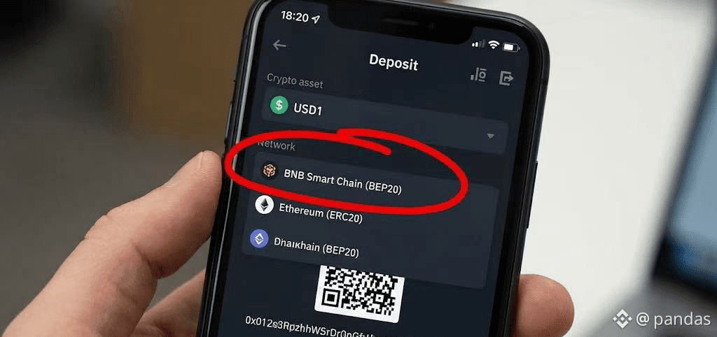 操作: 打开币安交易所 App -> 点击【充值】-> 搜索【USD1】-> 选择 BNB Smart Chain (BEP20) 网络。