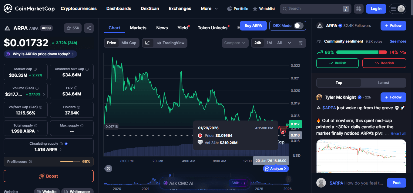 Wolumen ARPA wzrósł w niebo, sygnalizując silne gromadzenie przez wieloryby, które ignoruje szerszy makro strach. To klasyczny "lot w kierunku zmienności", gdzie traderzy poszukują zysku z dala od stagnujących głównych kryptowalut.