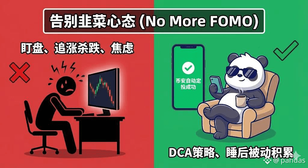 设定每日或每周固定金额投入。这是对抗 FOMO(害怕踏空)和 FUD(恐惧下跌)的唯一解药。记住,你在积累的是资产,而不是在赌博。