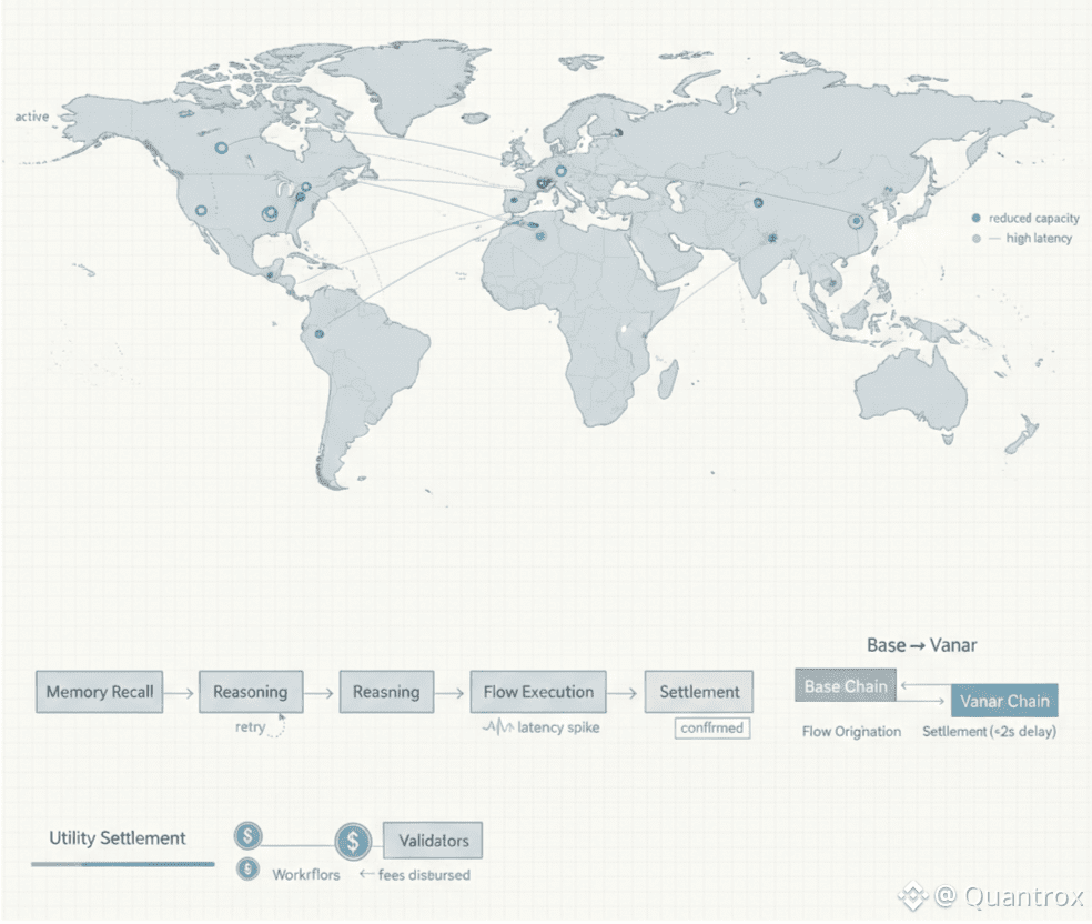 Watching Vanar operate isn’t clean or impressive in the way new L1 demos usually are. Validators are spread across regions, some clearly on modest setups, others on more robust infrastructure. Things occasionally lag. A Flow triggers late. A reasoning sequence has to retry. Nothing catastrophic, just the kind of friction you only see when something is actually being used instead of staged.